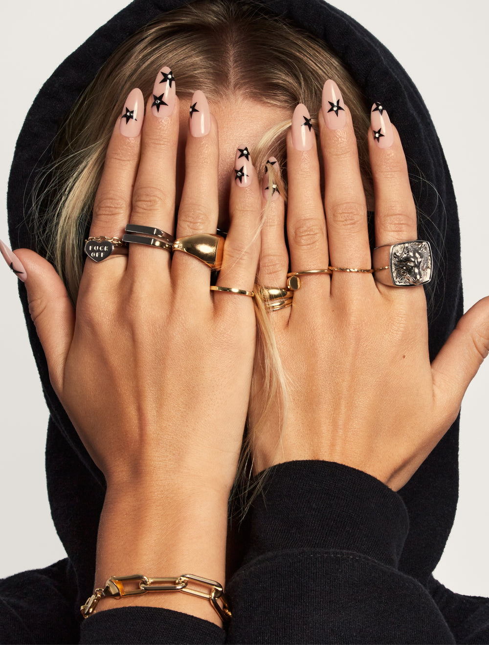 A new era of gel press-on extensions that finally checks all of the boxes. A perfect medium almond shape that mimics your natural nail, first-of-its-kind gel top coat technology that won’t chip, fade or tarnish, professional-grade adhesive glue, and designs that don’t follow trends, they set them.